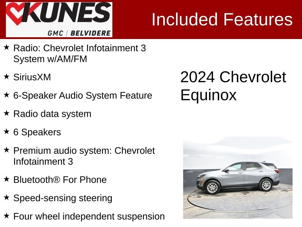 Certified. 2024 Chevrolet Equinox LT LT 2 USB Ports & Auxiliary Input Jack, 6 Speakers, 6-Speaker Audio System Feature, Bluetooth® For Phone, Compass, Delay-off headlights, Four wheel independent suspension, Front anti-roll bar, Front Center Armrest, Front reading lights, Illuminated entry, Outside temperature display, Overhead console, Premium audio system: Chevrolet Infotainment 3, Radio data system, Radio: Chevrolet Infotainment 3 System w/AM/FM, Rear anti-roll bar, Rear reading lights, Rear seat center armrest, SiriusXM, Speed-sensing steering, Variably intermittent wipers. Sterling Gray Metallic