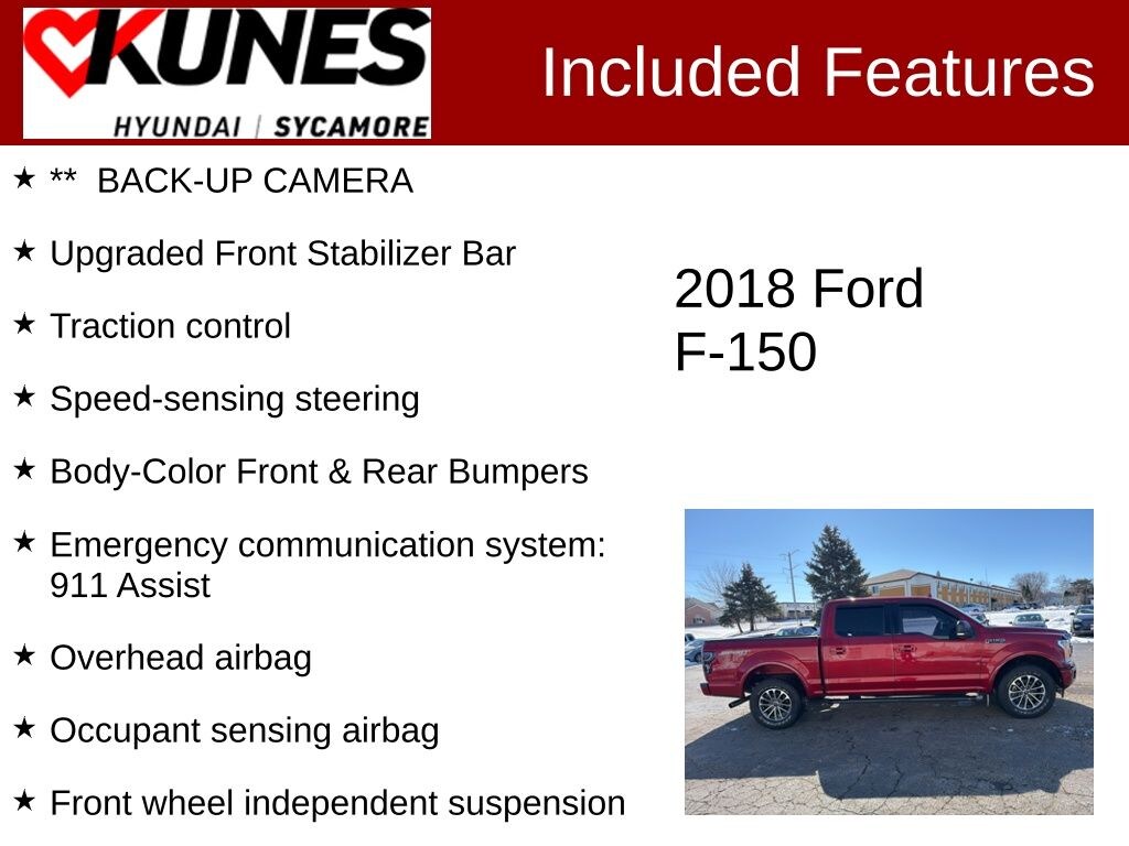 Recent Arrival! 2018 Ford F-150 XLT ** BACK-UP CAMERA, 2-Bar Style Grille w/2 Minor Bars Painted Dark, 2-Bar Style Grille w/Chrome 2 Minor Bars, 4.2" Productivity Screen in Instrument Cluster, 8-Way Power Driver Seat, Accent-Color Step Bars, Alloy wheels, Body-Color Door & Tailgate Handles, Body-Color Front & Rear Bumpers, Brake assist, Bumpers: chrome, Chrome Door & Tailgate Handles w/Body-Color Bezel, Chrome Step Bars, Cloth 40/20/40 Front Seat, Compass, Delay-off headlights, Driver door bin, Driver vanity mirror, Electronic Stability Control, Emergency communication system: 911 Assist, Front Center Armrest w/Storage, Front reading lights, Front wheel independent suspension, Heated Front Seats, Illuminated entry, Leather-Wrapped Steering Wheel, Occupant sensing airbag, Outside temperature display, Overhead airbag, Panic alarm, Passenger door bin, Passenger vanity mirror, Power door mirrors, Power Glass Heated Sideview Mirrors, Rear reading lights, Rear step bumper, Rear Under-Seat Storage, Security system, Single-Tip Chrome Exhaust, Speed control, Speed-sensing steering, Split folding rear seat, Tachometer, Telescoping steering wheel, Tilt steering wheel, Traction control, Upgraded Front Stabilizer Bar, Variably intermittent wipers, Voltmeter, Wheels: 17" Silver Painted Aluminum, Wheels: 18" Chrome-Like PVD.