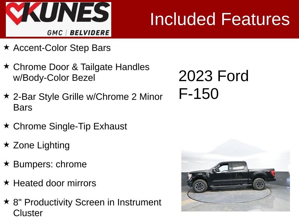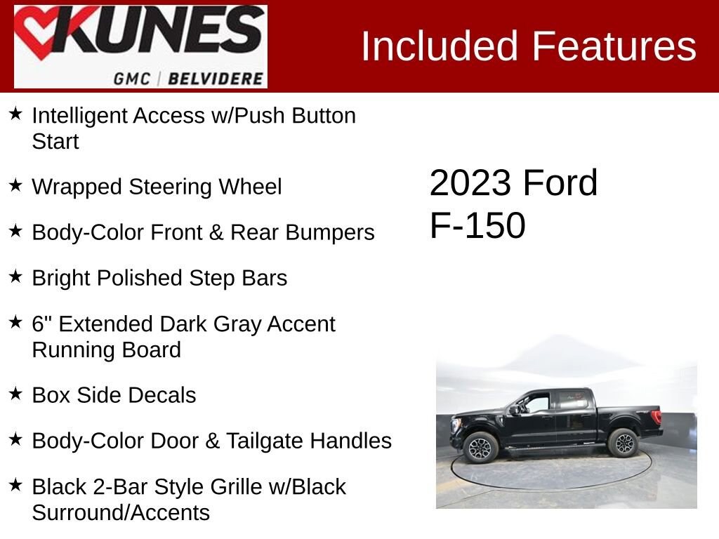 Recent Arrival! 2023 Ford F-150 XLT XLT 2-Bar Style Grille w/Chrome 2 Minor Bars, 6 Extended Dark Gray Accent Running Board, 8 Productivity Screen in Instrument Cluster, Accent-Color Step Bars, Auto-Dimming Rear-View Mirror, Black 2-Bar Style Grille w/Black Surround/Accents, Body-Color Door & Tailgate Handles, Body-Color Front & Rear Bumpers, Box Side Decals, Bright Polished Step Bars, Bumpers: chrome, Chrome Door & Tailgate Handles w/Body-Color Bezel, Chrome Single-Tip Exhaust, Cloth 40/20/40 Front Seat, Compass, Front Center Armrest w/Storage, Heated door mirrors, Illuminated entry, Intelligent Access w/Push Button Start, Outside temperature display, Overhead console, Passenger door bin, Passenger vanity mirror, Pro Trailer Backup Assist & Pro Trailer Hitch Assist, Rear reading lights, Rear Under-Seat Storage, Split folding rear seat, Wheels: 17 Silver Painted Aluminum, Wheels: 18 6-Spoke Machined Aluminum, Wheels: 18 Chrome-Like PVD, Wrapped Steering Wheel, Zone Lighting. Black MetallicOpened with Kunes in June 2020 along with Kunes CDJR of Belvidere, Kunes Cadillac GMC of Belvidere allows us to have another location close to home for you to find your ideal Cadillac or GMC vehicle. Being so close to Rockford, IL means that we are at a convenient location for many Illinois as well as Wisconsin residents. Previously Kunes Country, Kunes Auto Group has stayed true to our values with our slogan of Faith, Family, and Giving Back. These four words embody what Kunes Auto Group is all about. We strive to build people's lives and we live up to that by employing over 2,000 people and donating 10% of our yearly net profits to charities in our communities. Our dedication to our employees, customers, and communities is shown through our countless Automotive Newsâ Best Dealerships to Work For awards that are given to 100 dealers nationwide every year. While we make every effort to ensure the data listed here is correct, there may be instances where some of the options or vehicle features may be listed incorrectly as we get data from multiple data sources. PLEASE MAKE SURE to confirm the details of this vehicle with the dealer to ensure its accuracy. Dealer cannot be held liable for data that is listed incorrectly. Prices shown do not include taxes, license, and title fees and a $377.63 documentary service fee.