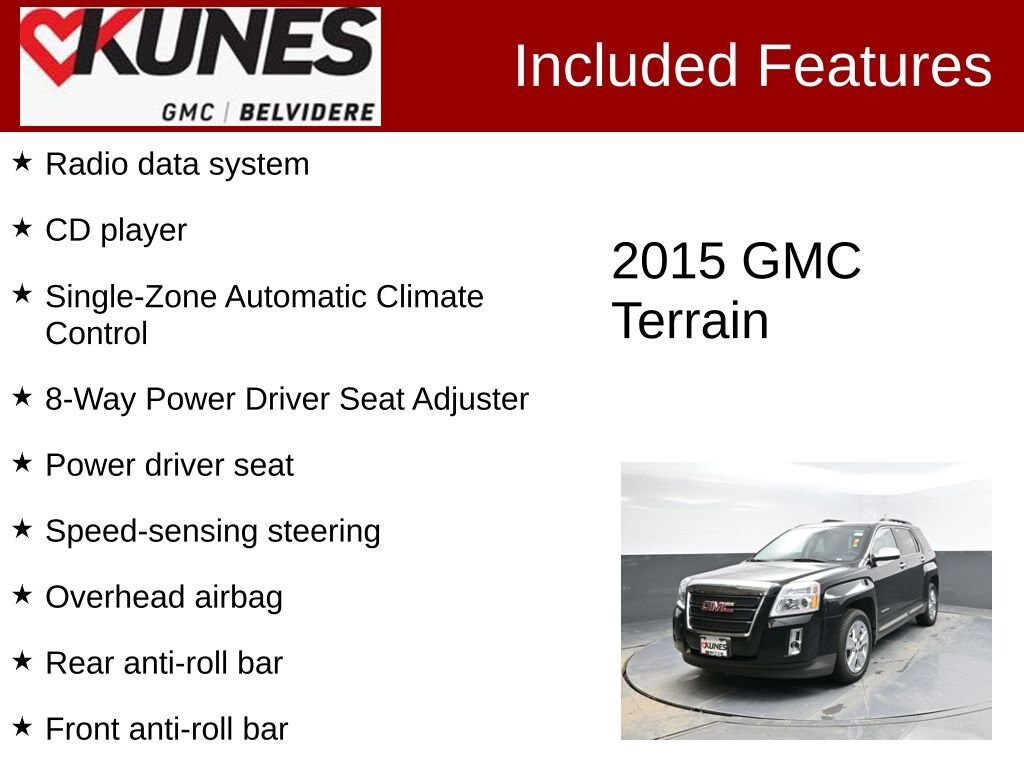 2015 GMC Terrain SLT-1 Onyx Black AWD 3.6L V6 DGI DOHC VVTRecent Arrival! Chrome Edition package with chrome wheels, heated mirrors, and power mirrors Open Road package adds navigation, power liftgate, remote trunk release, sun/moonroof, MP3 capability, and auxiliary audio input Chrome Appearance package with chrome wheels and heated/power mirrors Tow hitch included All-wheel drive, 3.6L V6 engine, and 6-speed automatic transmission Power liftgate for easy cargo access Sun/moonroof for extra natural light Heated front seats for added comfort Premium sound system with satellite radio Keyless entry, remote start, and push-button power doors Rearview camera for safer reversing Universal garage door opener Bluetooth connection for hands-free calls WiFi hotspot capability Privacy glass and fog lamps Leather-wrapped steering wheel with audio controls Stability control, traction control, tire pressure monitor Air conditioning and dual-zone climate control Driver and passenger airbags, side curtain airbags, child seat LATCH system Rear bench seat with pass-through functionality