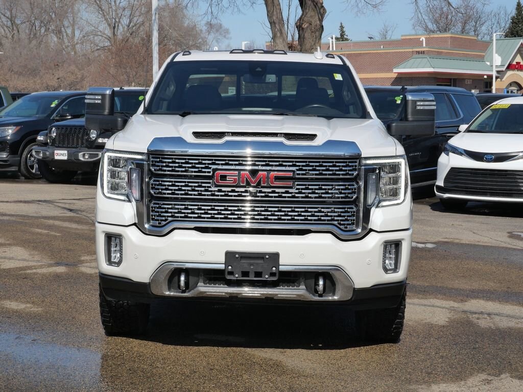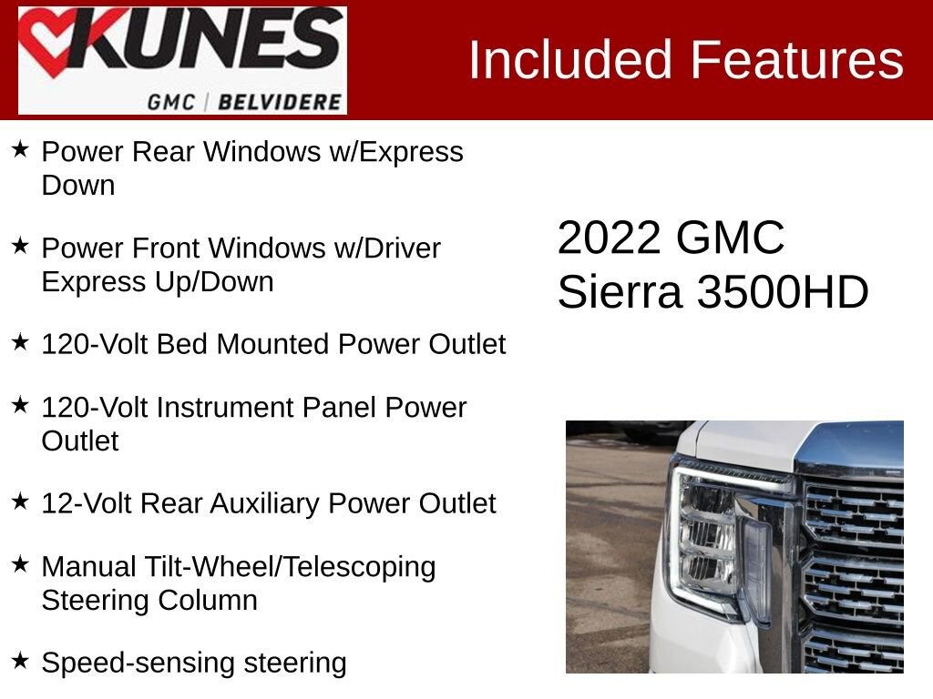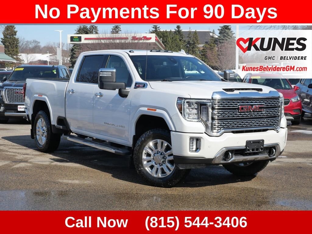 2022 GMC Sierra 3500HD Denali White Frost Tricoat 4WD Duramax 6.6L V8 TurbodieselRecent Arrival! Clean CARFAX. CARFAX One Owner. 6.6L V8 diesel turbocharged engine, 10-speed automatic transmission Sunroof/moonroof Blind spot monitor, cross-traffic alert, rear parking sensors, lane departure warning, forward collision warning Tow package with integrated hitch and ProGrade Trailering System Running boards Heated front seats with cooled seat function Premium sound system Power-adjustable, heated, and folding mirrors Remote engine start and keyless entry Rearview camera with aerial view display Front and rear fog lamps, daytime running lights Privacy glass, integrated tailgate step Heavy-duty alternator and air filtration system Power adjustable driver and passenger seats with memory settings Multi-zone climate control and steering wheel audio controls WiFi hotspot, auxiliary audio input, satellite radio, MP3 player Power locks, windows, power outlet, rear defrost Stability and traction control, security system, multiple airbags Tire pressure monitor and all-terrain tires Snow plow prep/camper package