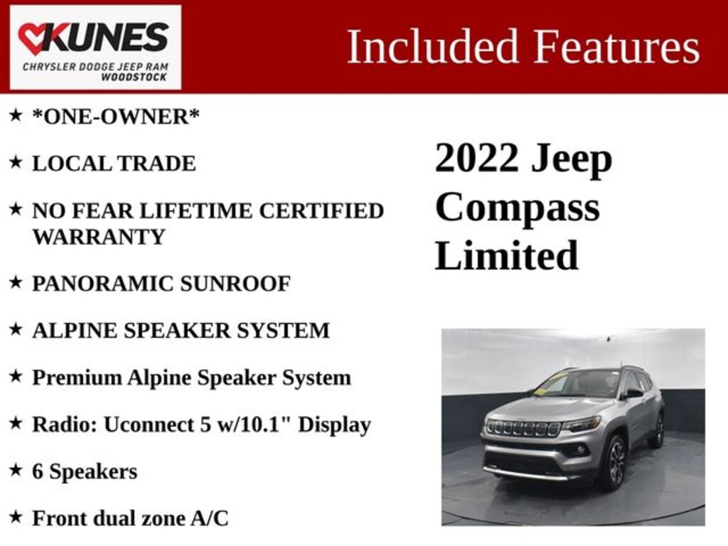 Recent Arrival! Certified. New Price! 2022 Jeep Compass Limited 4WD Billet Silver Metallic Clearcoat *ONE-OWNER*, LOCAL TRADE, NO FEAR LIFETIME CERTIFIED WARRANTY, PANORAMIC SUNROOF, ALPINE SPEAKER SYSTEM, 4WD, 10.1" Touchscreen Display, 6 Speakers, Anti-whiplash front head restraints, Delay-off headlights, Disassociated Touchscreen Display, Emergency communication system: SiriusXM Guardian, Four wheel independent suspension, Front anti-roll bar, Front Center Armrest w/Storage, Front dual zone A/C, Global Telematics Box Module (TBM), Gloss Black Exterior Mirrors, Illuminated entry, Occupant sensing airbag, Outside temperature display, Overhead console, Panic alarm, Premium Alpine Speaker System, Radio: Uconnect 5 w/10.1" Display, Rear anti-roll bar, Rear seat center armrest, Roof rack: rails only, Split folding rear seat, Tachometer, Tilt steering wheel.