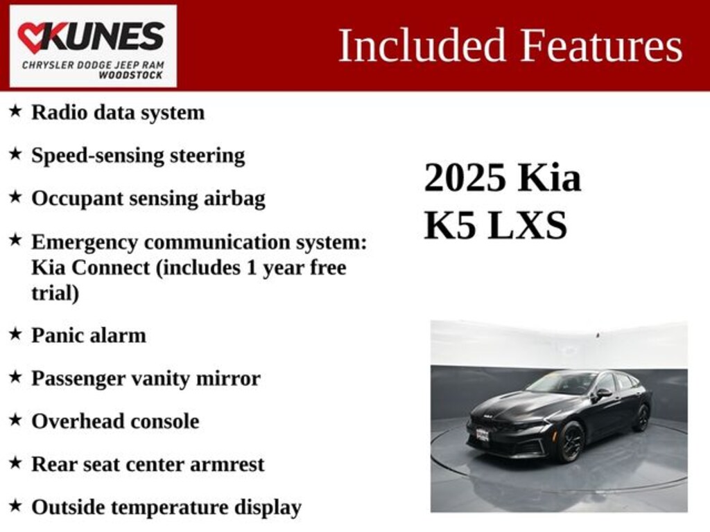 The 2025 Kia K5 LXS is a remarkable sedan that combines style, performance, and cutting-edge technology. With its sleek black exterior and well-appointed interior, this vehicle is a true standout on the road.
