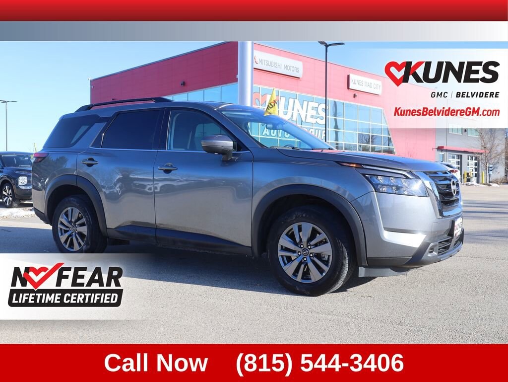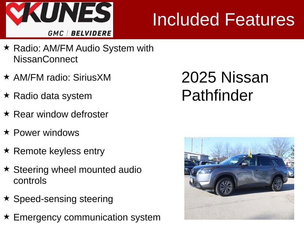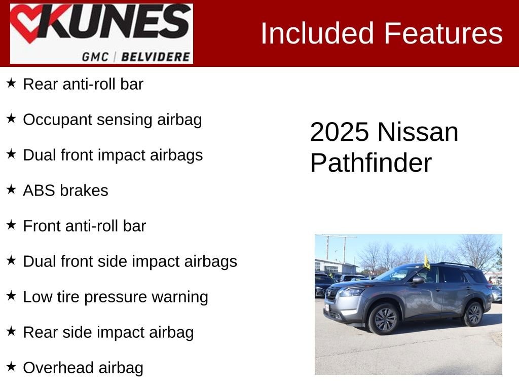 Recent Arrival! Certified. 2025 Nissan Pathfinder SV SV 4-Wheel Disc Brakes, ABS brakes, AM/FM radio: SiriusXM, Bench Seat Carpeted Floor Mats (set of 4), Brake assist, Bumpers: body-color, Cloth Seating Surfaces, Delay-off headlights, Driver door bin, Driver vanity mirror, Dual front impact airbags, Dual front side impact airbags, Electronic Stability Control, Emergency communication system, Front anti-roll bar, Front Center Armrest, Front reading lights, Fully automatic headlights, Heated door mirrors, Illuminated entry, Leather steering wheel, Low tire pressure warning, Occupant sensing airbag, Outside temperature display, Overhead airbag, Overhead console, Panic alarm, Passenger door bin, Passenger vanity mirror, Power door mirrors, Power Liftgate, Power windows, Radio data system, Radio: AM/FM Audio System with NissanConnect, Rear anti-roll bar, Rear reading lights, Rear seat center armrest, Rear side impact airbag, Rear window defroster, Rear window wiper, Remote keyless entry, Security system, Speed control, Speed-sensing steering, Split folding rear seat, Spoiler, Steering wheel mounted audio controls, Telescoping steering wheel, Tilt steering wheel, Trip computer, Turn signal indicator mirrors, Variably intermittent wipers. Gun Metallic